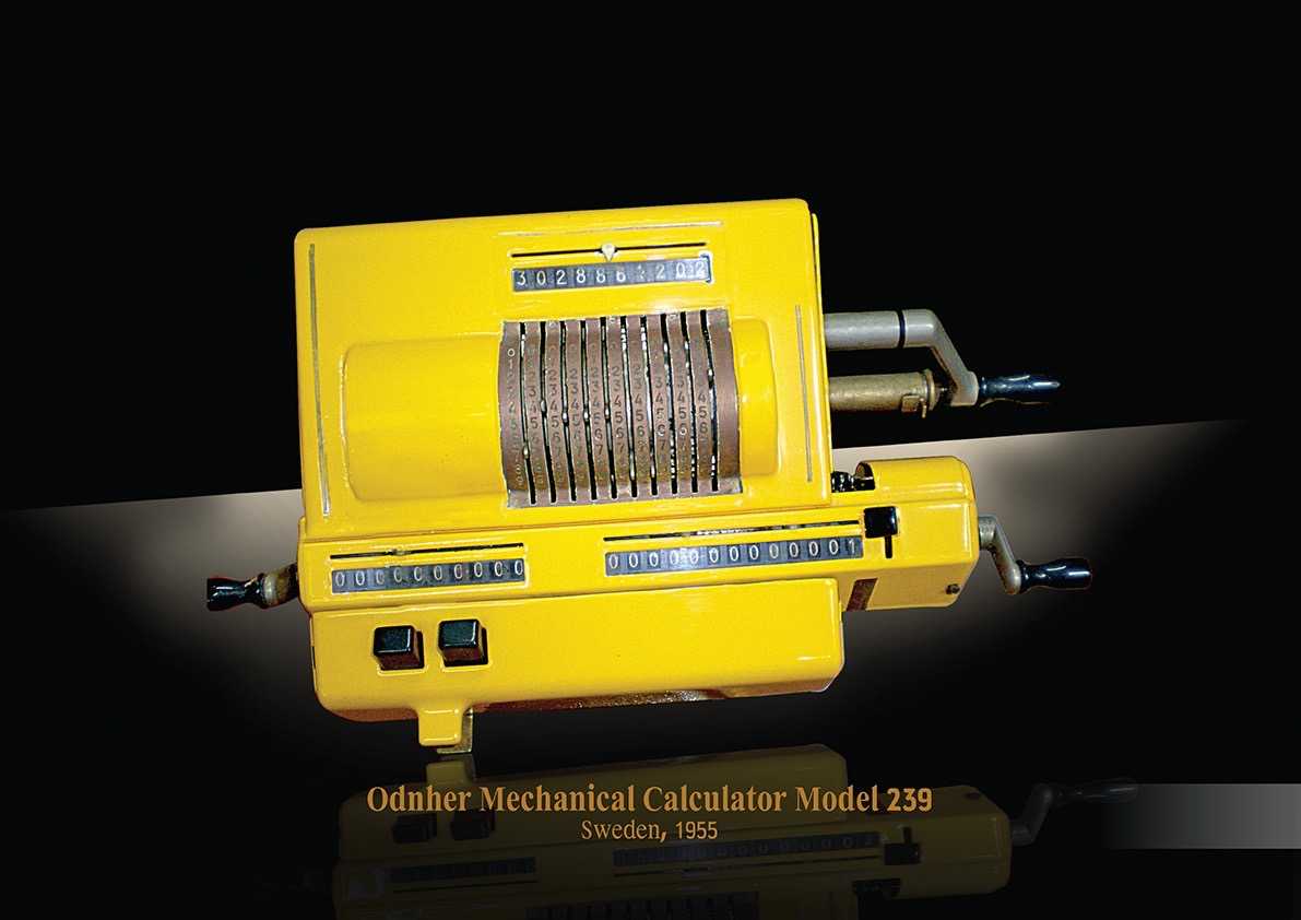 Odhner Mechanical Calculator Model 239 (Sweden, 1955) - 205Bright yellow and industrial in design, the Odhner Model 239 is a post-war evolution of the classic pinwheel calculator. By the 1950s, these machines were found on desks from ...