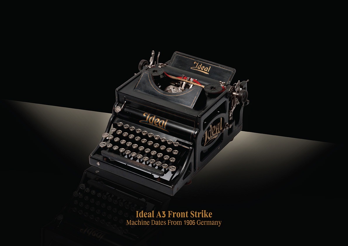 This is the Ideal A3 Front Strike, Germany, 1906. <... This is the Ideal A3 Front Strike, Germany, 1906. With its elegant black frame and gold lettering, the Ideal A3 was more than just a pretty machine—it was a robust, efficient front-strike typewriter made to compete with giants like Remington. Its front-striking mechanism allowed users to see their text as it was typed, a major advantage over earlier blind writers. Built by Seidel & Naumann in Dresden, it’s a beautiful example of German engineering and early efforts to improve visibility and workflow for typists.